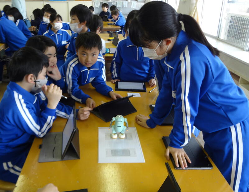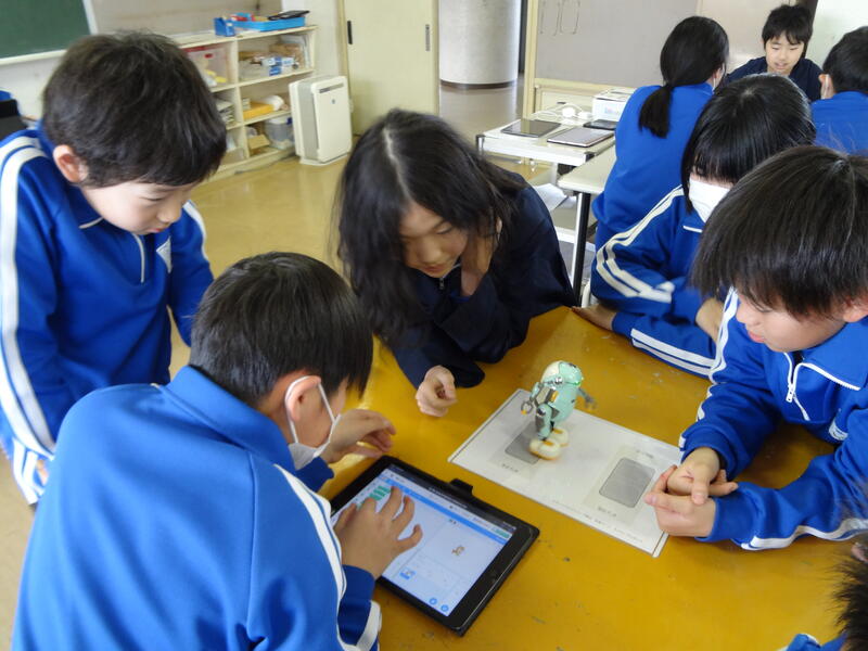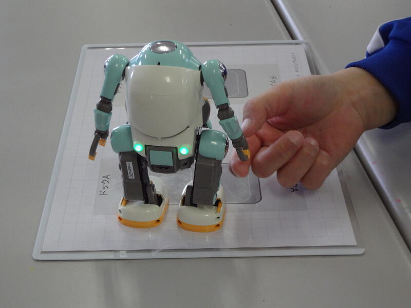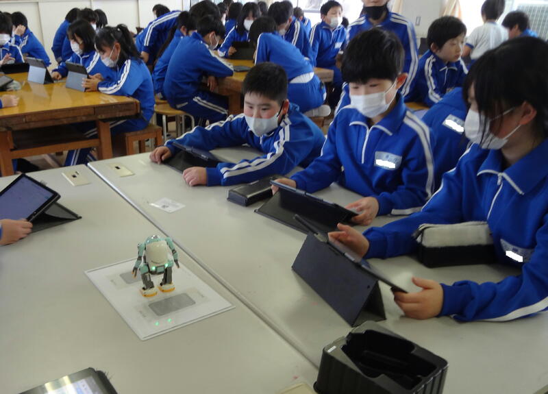 「6歩あるく」「右うでを上げる」など、タブレットに指示を入力し、動かしてみます。