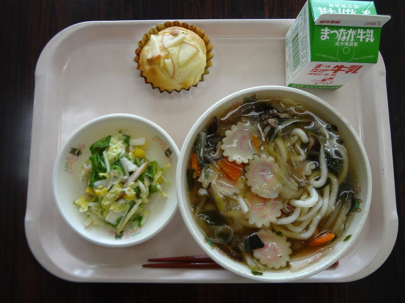 今日の給食は、肉うどん・みずなとコーンのサラダ・りんごのヨーグルトケーキ・牛乳でした。