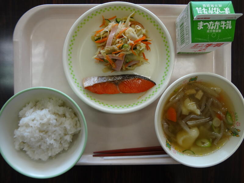 今日の給食は、むぎごはん・さけのしおやき・すいとんじる・きりぼし大根のサラダ・牛乳でした。