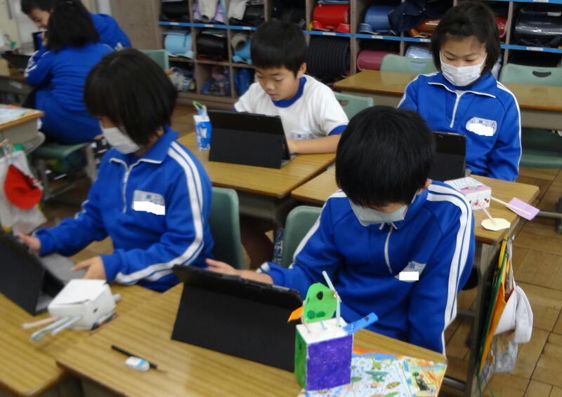 2年生は、図画工作科の学習で、自分の作品について、工夫した点などをタブレットで伝え合っていました。