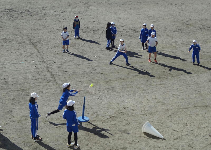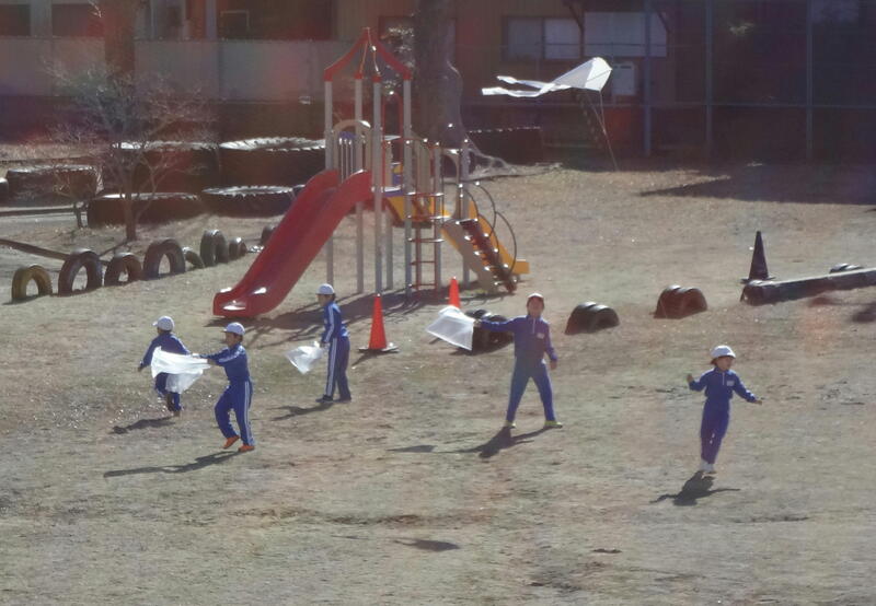 校庭では、ひばり学級の子どもたちがたこあげを楽しんでいます。