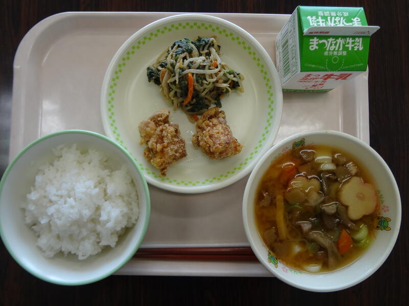 今日は学校給食週間最終日。献立は、ごはん・とりにくのからあげ・ほうれんそうのきなこ和え・ずいきのみそしるでした。