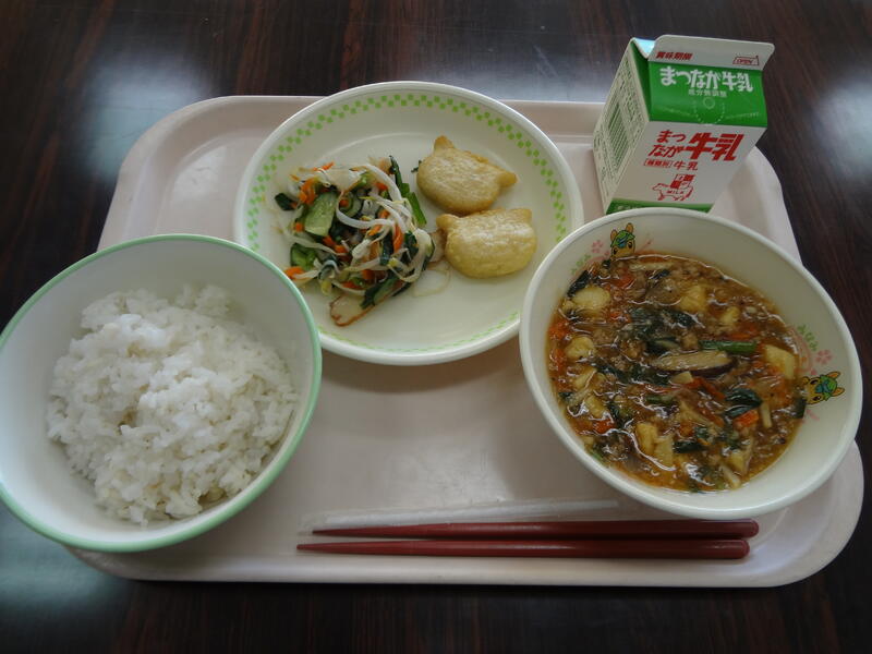 今日の給食は、むぎごはん・マーボーどうふ・たこナゲット・こまつなのあえもの・牛乳でした。
