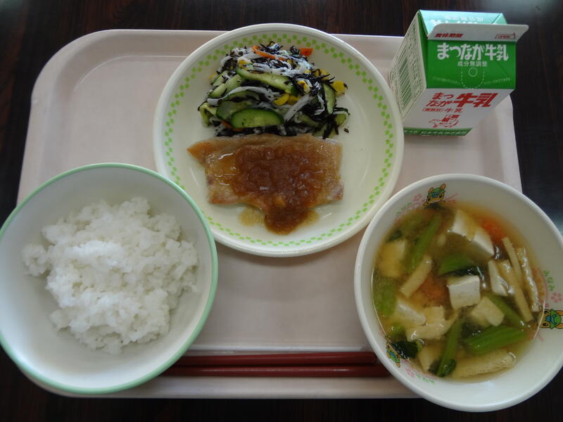 今日の給食は、ごはん・豚肉のアップルソースがけ・ひじきサラダ・えのきいりみそ汁・牛乳でした。