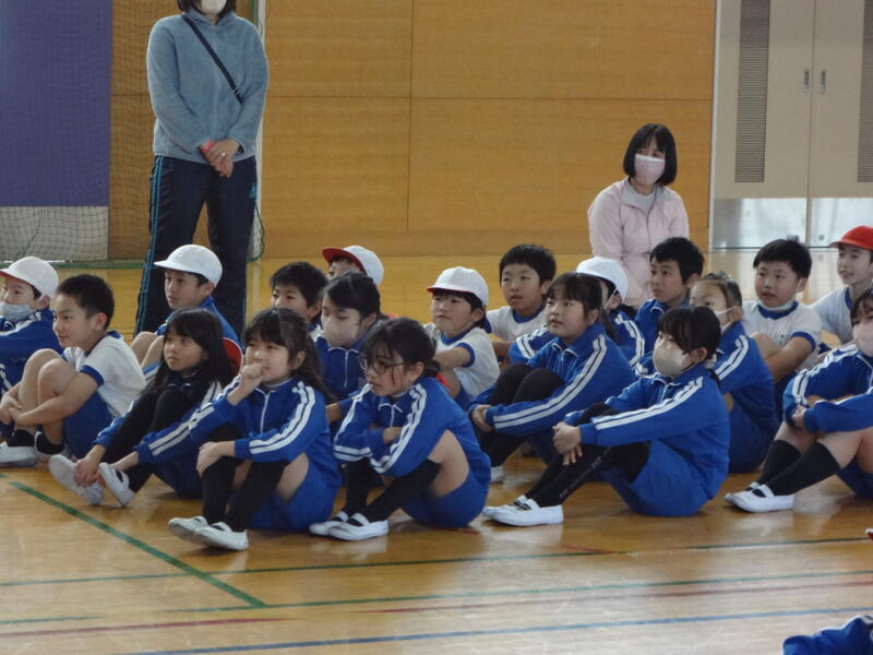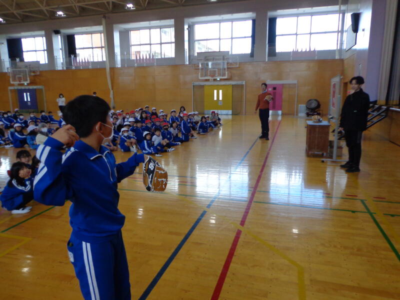 さっそく「野球しようぜ!」ということで、56年生代表児童による校長と体育担当教員とのキャッチボールを行いました。