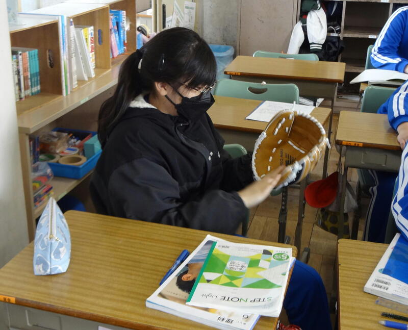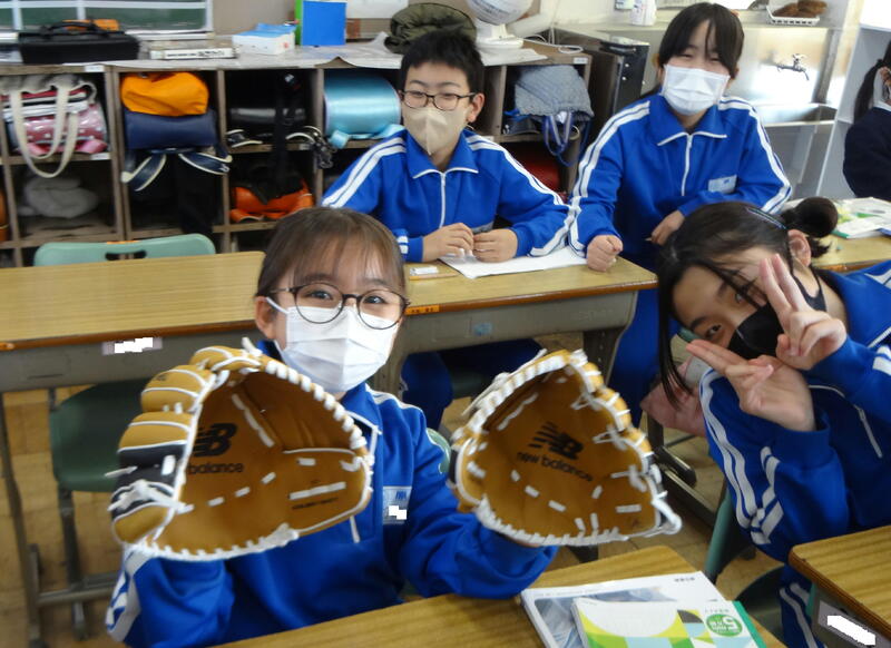 その後、各学級にグローブ披露です。6年生、うれしそうです。