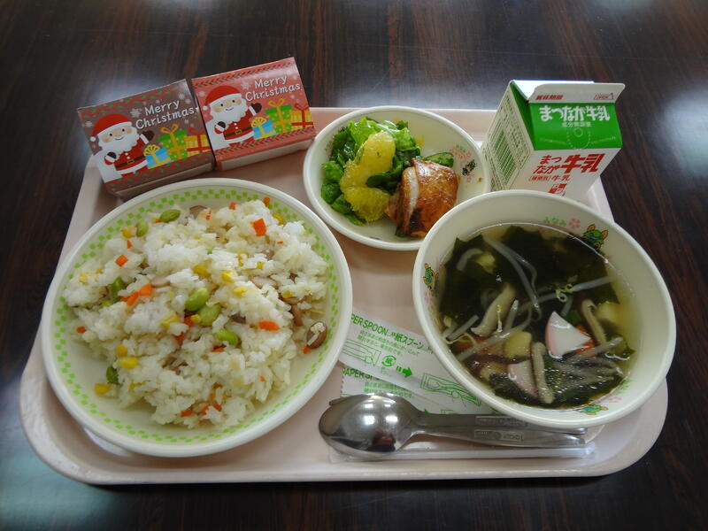 今日の給食は、クリスマスセレクトケーキ・タンドリーチキン・カラフルご飯・グリーンサラダ・わかめスープでした。