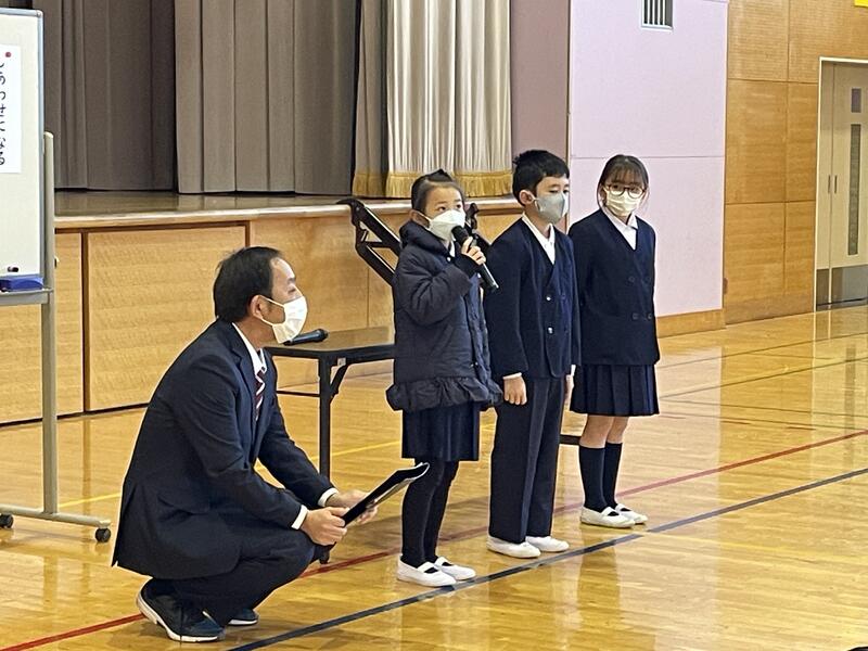 2・4・6年生の代表児童が、インタビュー形式で冬休みの思い出と3学期の抱負を述べました。