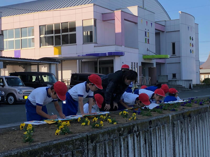 花壇のパンジーをよく観察して、スケッチし、気づいたことをメモしています。