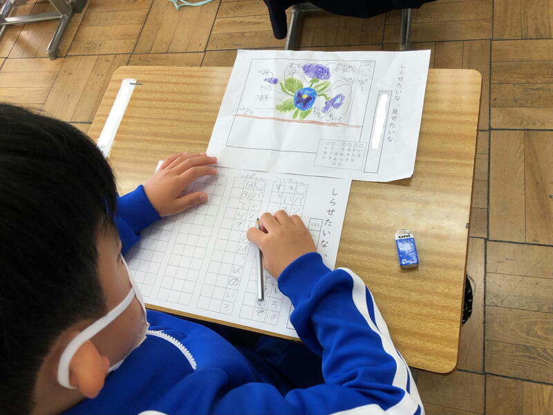 1年生は、国語科で、学校で見つけたものについて、身近な人に伝えるために、観察して文章に書く学習を進めています。