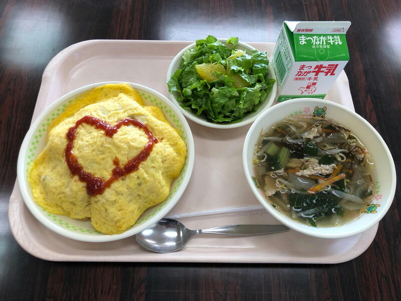 今日の給食は、セルフオムライス・グリーンサラダ・もずくスープ・牛乳でした。