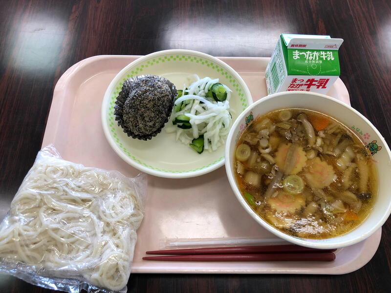 今日の給食は、肉うどん・だいこんのあさづけ・ごまおはぎ・牛乳でした。
