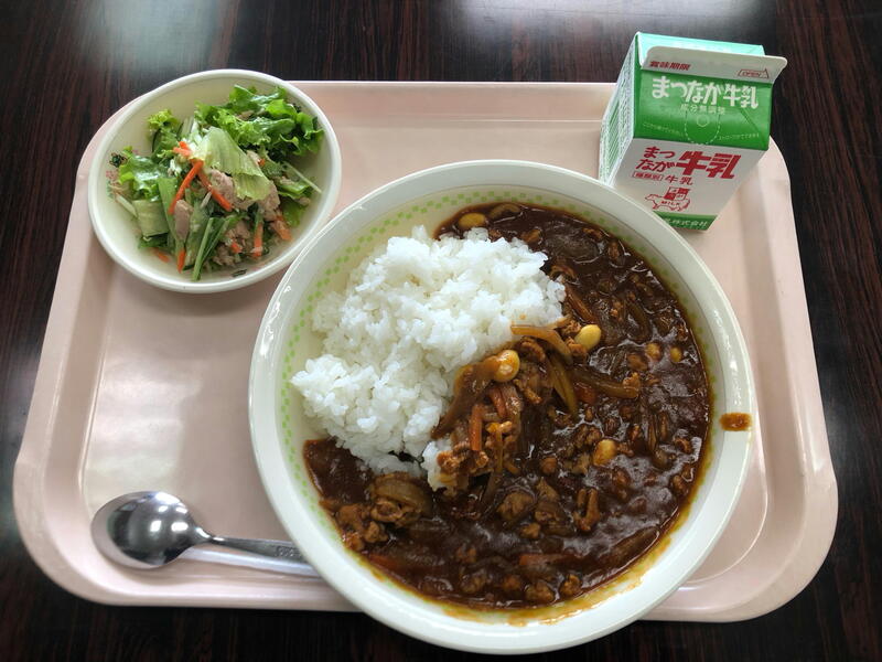 今日の給食は、ハヤシライス・みずなのサラダ・牛乳でした。
