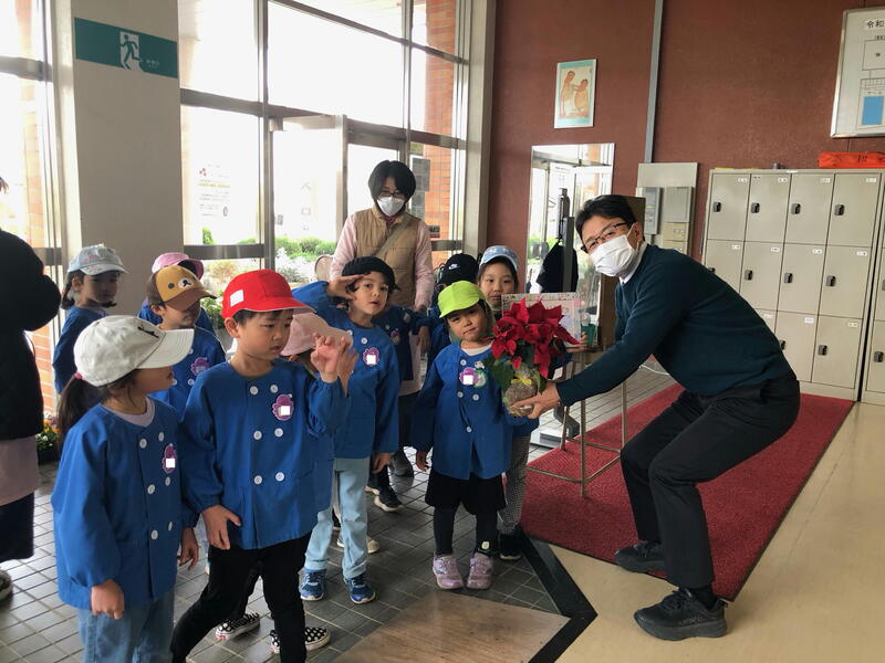 2023年11月15日 11時20分聖愛こども園の年長さんたちが来校し、「聖愛こども園サンクスデイ」ということで、感謝のメッセージとともにきれいなポンセチアをいただきました♪