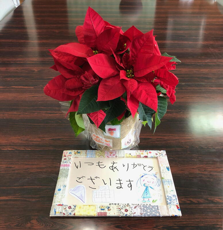 聖愛こども園の年長さんたちが来校し、「聖愛こども園サンクスデイ」ということで、感謝のメッセージとともにきれいなポンセチアをいただきました♪