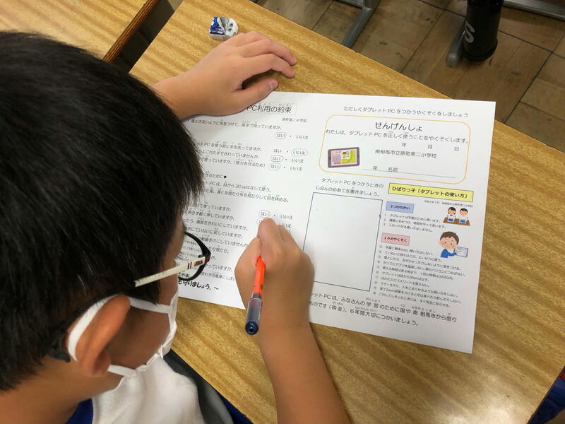 5年生は、学級活動の時間にタブレット使用のきまりを確認し、「わたしは、タブレットPCを正しくつかうことを約束します」宣言を行っていました。