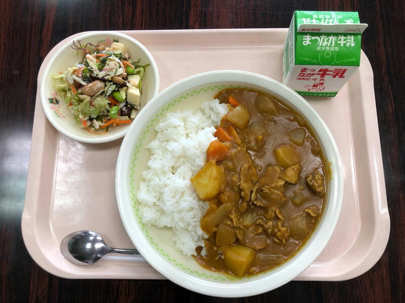 今日の給食は、ポークカレー・とうふのサラダ・牛乳でした。