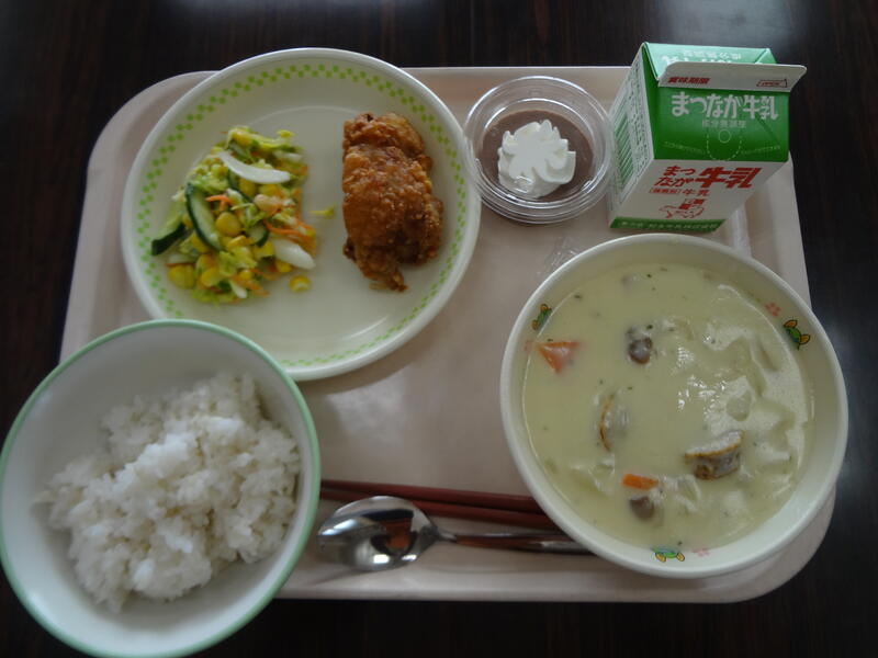 むぎごはん・鶏肉のからあげorかじきかつ・コールスローサラダ・クラムチャウダー・手作りココアプリンor手作りいちごゼリー・牛乳でした。