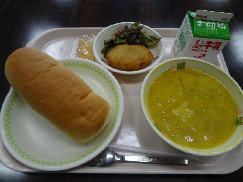 今日の給食は、コッペパン・県産梨ジャム・県産ポークコロッケ・添えサニーレタス・キャベツと鶏肉のカレーミルクスープ・牛乳でした。