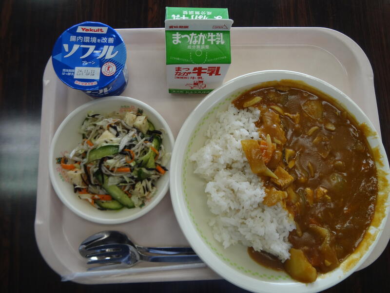今日の給食は、森のきのこカレーライス・とうふとひじきのサラダ・ヨーグルト・牛乳でした。
