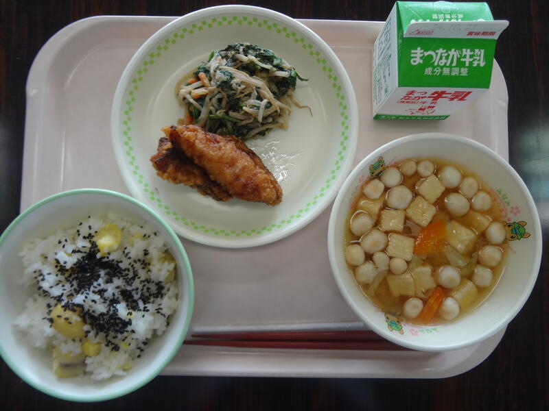 今日の給食は、くりいもごはん・あかうおの竜田揚げ・ほうれんそうのきなこ和え・キャベツのみそ汁・牛乳でした。