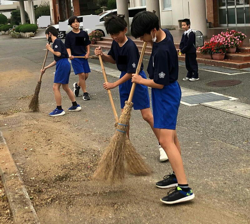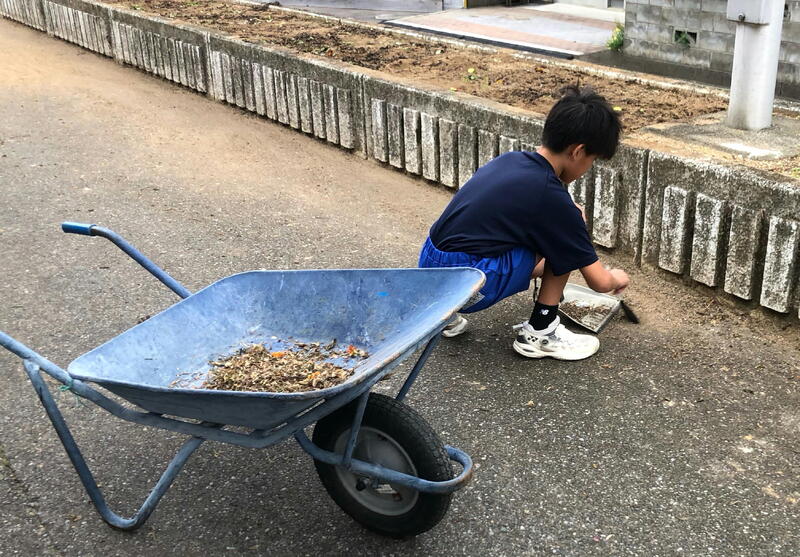 今朝、5年生たちが昨日の花抜き作業で残った草や土を掃いていました。