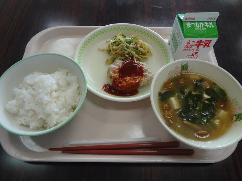 今日の給食は、ごはん・おからハンバーグ・もやしのカレー和え・なめこのみそ汁・牛乳でした。
