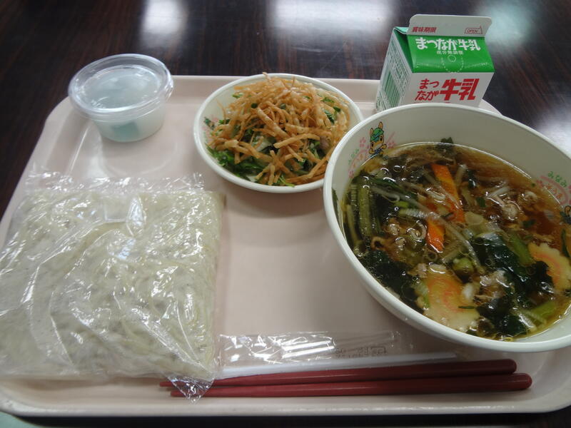 今日の給食は、しょうゆラーメン・パリパリサラダ・ラクピスゼリー・牛乳でした。