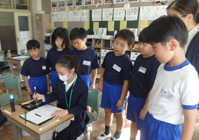 毛筆が得意な一日校長先生。お手本を書いてあげています。