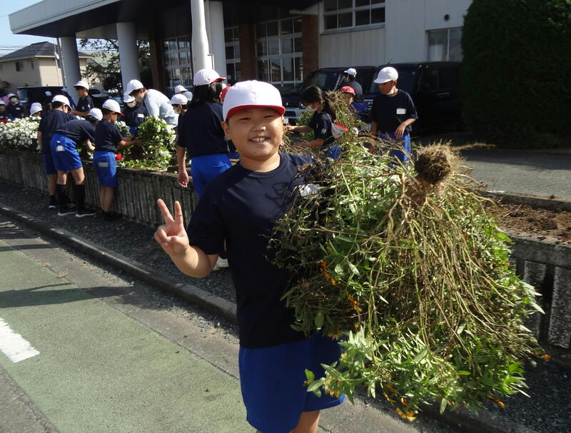 今日は、全校生で花を抜く作業を縦割り班で行いました。