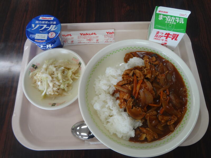 前期最後の給食は、ハヤシライス・こんにゃくサラダ・ヨーグルト・牛乳でした。