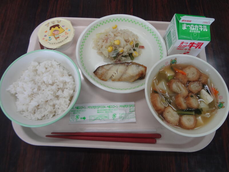 後期最初の給食は、むぎごはん・ほっけのしおやき・切り干し大根のソテー・じゃがいものみそ汁・プリン・牛乳でした。