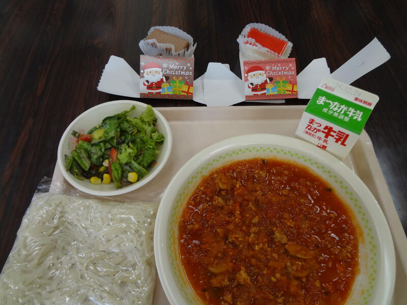 今日の給食は、スパゲティミートソース・イタリアンサラダ・セレクトクリスマスケーキ(チョコ・いちご)・牛乳でした。あと1週間でクリスマス。少し早いクリスマスメニューにひばりっ子の笑顔が広がりました。