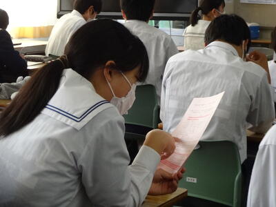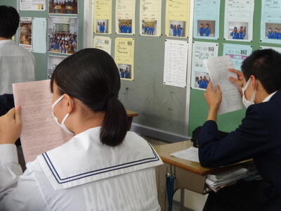 基礎的・基本的な学習内容の定着を図るために、全校同一問題(1年生の内容)で5教科の基礎学力テストを実施しています。今日は理科のテスト。3年生だからできるだろうと思いきや、忘れていることも多いようで、皆本気で復習しています。