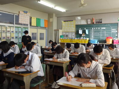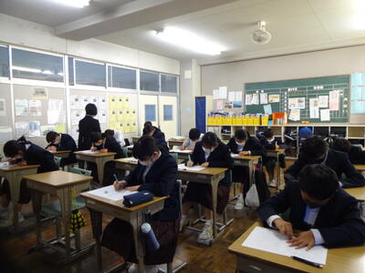 2022年11月16日 15時10分基礎的・基本的な学習内容の定着を図るために、全校同一問題(1年生の内容)で5教科の基礎学力テストを実施しています。今日は理科のテスト。3年生だからできるだろうと思いきや、忘れていることも多いようで、皆本気で復習しています。