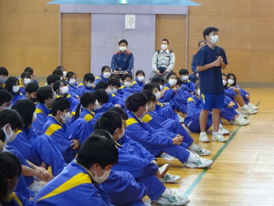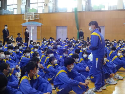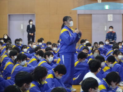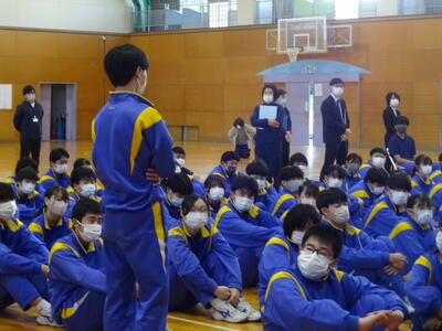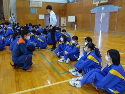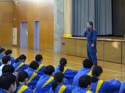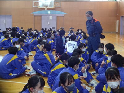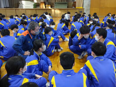 校庭に避難した後、体育館で自分達の避難行動を振り返りました。「非常ベルを聞いて緊張してしまった」「先生の指示がなくてもきちんと避難できた」「普段は使わない非常階段を使って避難した」「火元に近づかないように西階段を通ればよかった」など、様々な感想が出されました。消防士の方に質問している生徒もいました。いつ、どこで、何が起きても、臨機応変に対応し、自分の命も人の命も守っていけるよう、訓練を積んでいきましょう。