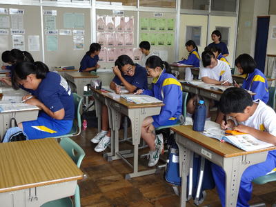 夏休みの計画表、順調です! 2019年7月25日 14時26分 雨のために部活動ができない日、テニス部は室内で静かに学習をしていました。計画通りに宿題などを進めている姿があちこちに見られ、うれし限りです。これからも1日最低3時間の学習をしっかり続けてほしいと思います。