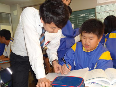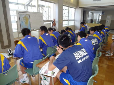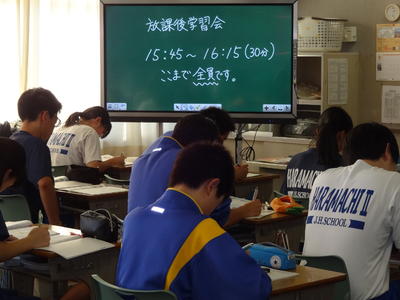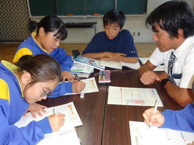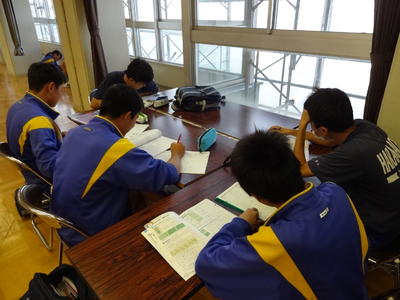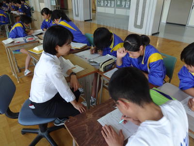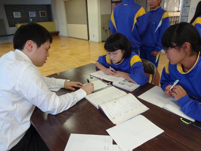 10月4日は中間テスト。その対策として放課後学習会を開いています。全校生徒が6校時終了後、学年の計画に従ってテスト対策を進めます。音楽の先生が数学を教えたり、美術の先生が英語を教えたり、全教員が総掛かりで生徒達の学習をサポートしています。また、各階のホールに設けた教科のコーナーには多くの生徒達が集まり、積極的に質問しています。この勢いで家庭学習も進めてほしいと思います。