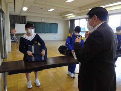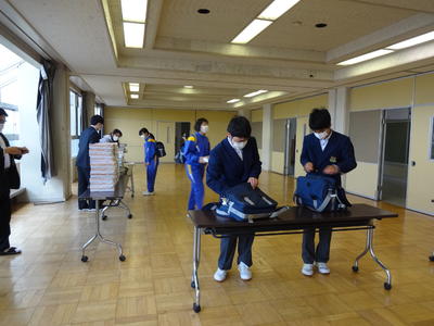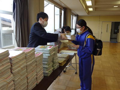 2020年4月27日 16時49分今日は、1、2年生に教材を配付しました。クラスごとに1時間ずつの配付時間を設定したところ、どのクラスも時間を守って登校し、早々と配付が完了しました。久しぶりに会う生徒達と話をするのは、嬉しい楽しいひとときでした。「宿題を全部終わらせました!」と笑顔で報告する生徒、朝6時半に起床し、8時から学習を始めている生徒、中には塾のオンライン学習で1日7時間勉強しているという生徒も!