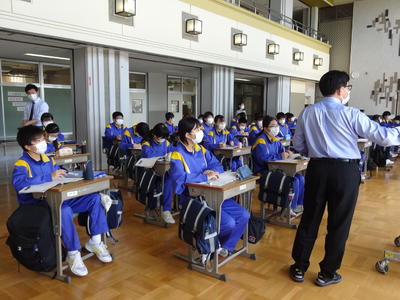 本日から分散登校が始まり、各学年の1組の生徒達が登校しました。3密を避けるために、1階から3階のホールを利用して設置された特設の教室では、生徒達が真剣に授業に取り組んでいました。