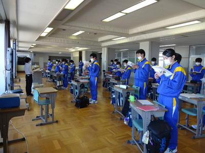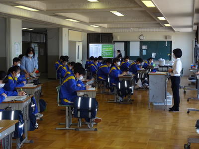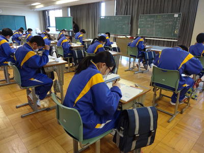 今日は、各学年3組の登校日です 2020年5月14日 13時48分 1年生は、「正負の数の加法・減法」です。6時間目だというのに、すごい集中力です。3年生は、「春に」です。晴れ晴れとした声で音読していました。教師も互いに支援し合ったり、学び合ったりしていました。