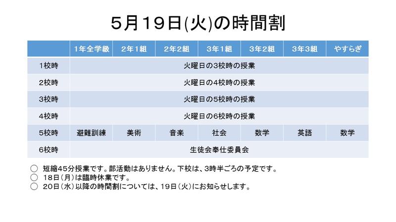 19日(火)から全員登校となります。それに伴い、来週の時間割が変更になりますので、ご確認をお願いします。