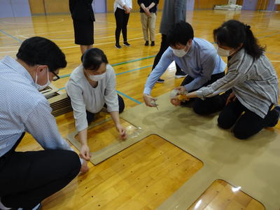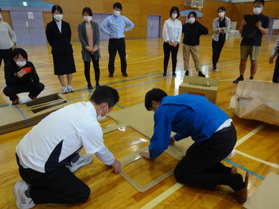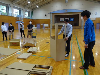 飛沫感染を予防するためのパーティションを全校生徒分いただきました。今日は、まず教職員が組み立て方や使い方の講習を受けました。その後、実際に作ってみました。段ボールにアクリルのシートを貼り付けるだけなのですが、いろいろコツがあるようです。明日生徒に伝授したいと思います。