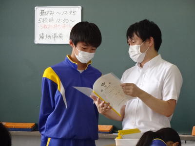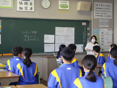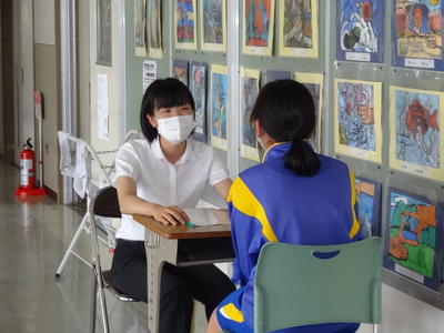 1学期最後の学級活動。主な内容は、1学期の振り返りと、夏休みの生活、そして通知表です。通知表を受け取るときに、担任からの説明を一つ一つうなずきながら聞いている生徒達の姿が印象的でした。評定と担任からのメッセージをしっかり受けとめて2学期に臨んでほしいと思います。