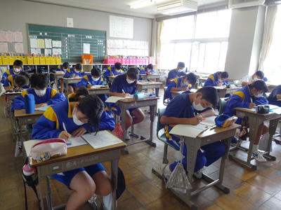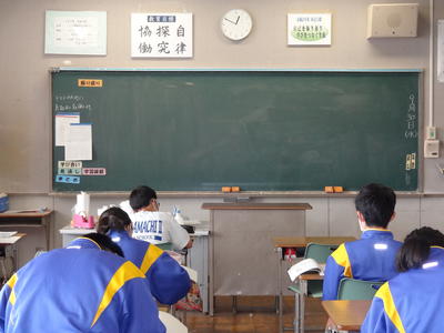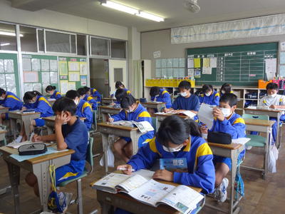 寸暇を惜しんで勉強しています 2020年9月30日 14時52分 只今、12時50分。普段なら廊下や校庭に生徒達のにぎやかな声が響いていますが、明日の中間テストを前に、皆、教室で黙々と学習に励んでいます。ラストスパート!健闘を祈ります。