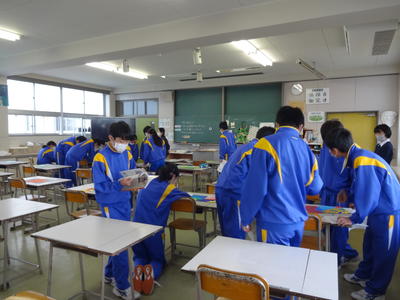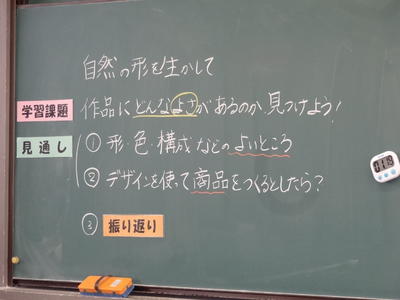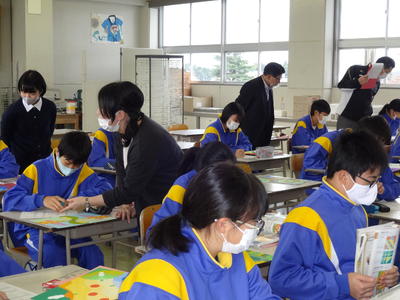 今日は、1年2組の美術科の授業研究会。自然の形を生かしてデザインした「平面構成」を相互に鑑賞する授業です。生徒達は、形の魅力や構成の工夫、色使い等の観点から、美術用語を用いて隣の人の作品を鑑賞・分析した後、「このデザインを使って商品をつくるとしたら?」という視点で多くの級友の作品を観察し、デザインを生活に結びつけて考えていました。生徒達のユニークな発想に驚かされました。