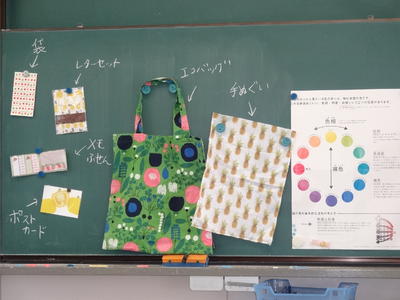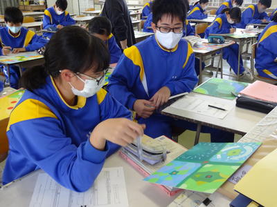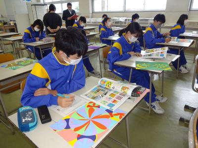 2020年11月2日 11時37分今日は、1年2組の美術科の授業研究会。自然の形を生かしてデザインした「平面構成」を相互に鑑賞する授業です。生徒達は、形の魅力や構成の工夫、色使い等の観点から、美術用語を用いて隣の人の作品を鑑賞・分析した後、「このデザインを使って商品をつくるとしたら?」という視点で多くの級友の作品を観察し、デザインを生活に結びつけて考えていました。生徒達のユニークな発想に驚かされました。