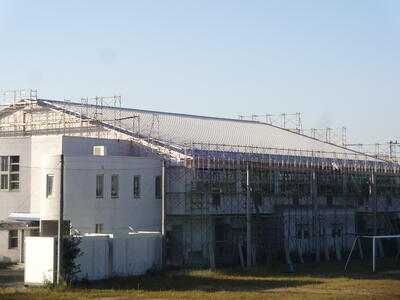 体育館の雨漏り防止のため、屋根の修繕工事を行っています。工期は11月24日(木)までです。工事車両等には十分気をつけましょう。