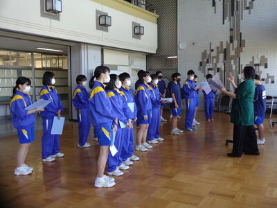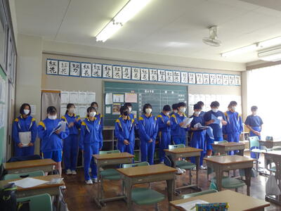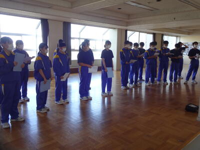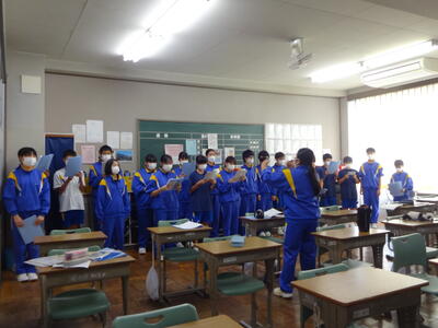 2022年10月11日 13時48分今月21日の塔下祭(文化祭)に向けて、各学級の合唱練習が本格的に始まりました。歌詞の解釈を確認したり、パート練習をしたりと、指揮者を中心に各学級が工夫しながら練習していました。自分たちで改善策を考えて取り組んでいる姿が素晴らしいと思います。