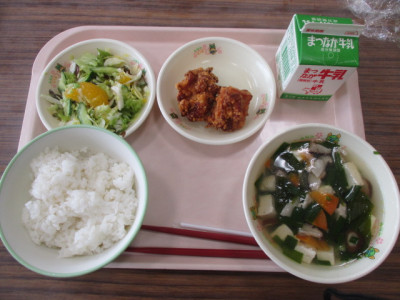○ごはん ○鶏肉の唐揚げ ○夏みかんサラダ ○ニラのとろみ汁 ○牛乳